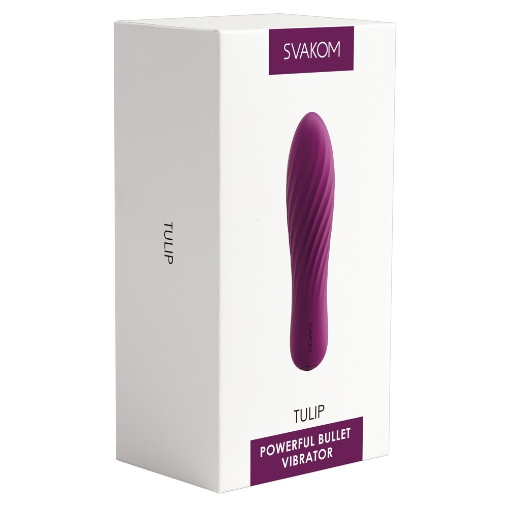 Leistungsstarker Vibrator Tulip von SVAKOM mit gebogenem und geriffeltem Design. Dieser Silikonvibrator ist klein, kompakt, leistungsstark, extrem weich und liegt sehr angenehm in der Hand – er passt problemlos in jede Handtasche.