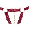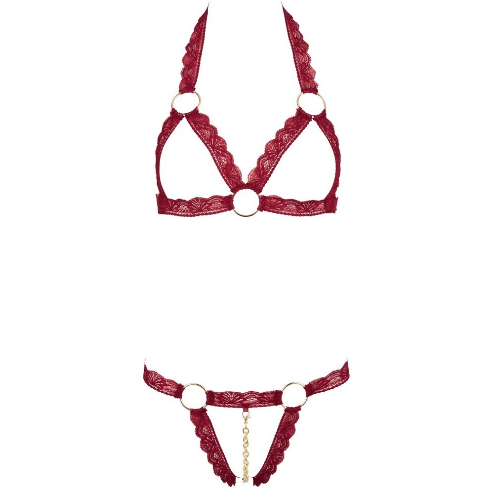 BH aus elastischen Spitzenbändern mit dekorativen Metallringen. Die Cups sind offen und der String verfügt über eine abnehmbare Kette über dem offenen Schrittbereich mit einem Druckknopf an jedem Ende.