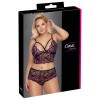 BH und String ohne Bügel mit tiefem Ausschnitt von Cottelli CURVES, vollständig aus weicher, elastischer Blumen-Spitze gefertigt, in zwei verschiedenen Farben erhältlich. Die Spitze schmiegt sich sanft an den Körper an und lässt die Haut verführerisch durchscheinen. Der BH hat elastische Bänder im Ausschnittbereich, die die Cups betonen und für eine perfekte Passform angepasst werden können.