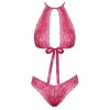 Verführerisches Set von Kissable, bestehend aus einem weichen BH und einem String mit eleganten Satinbändern. Der BH ist vorne mit einer Schleife verziert, während der String am V-Ausschnitt oberhalb des Schambereichs eine Schleife aufweist. Komplett aus feiner, weicher und elastischer rosa Spitze gefertigt, für höchsten Tragekomfort. Der BH verfügt über einen Hakenverschluss am Nacken und am Rücken für eine perfekte Passform.