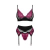 Dreiteiliges Set Rosenty von Obsessive, bestehend aus Bügel-BH, Strumpfgürtel und String. Weiches schwarzes Gewebe kombiniert mit zarter rosa Spitze ergibt eine elegante Mischung mit blickdichtem Stretchstoff. Der BH hat ein zartes dekoratives Element zwischen den Cups, Bügel und einen verstellbaren Hakenverschluss am Rücken sowie verstellbare Träger für eine perfekte Passform. Die Träger des Strumpfhalters und der Hakenverschluss am Gürtel sind ebenfalls verstellbar und ermöglichen so eine individuelle Passform.