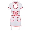 Kurzes, halbtransparentes weißes Kleid im Krankenschwesterstil von Cottelli COSTUMES mit kontrastierenden roten Details. Eng anliegendes, elastisches Modell mit halblangen Ärmeln und gewagtem Ausschnitt. Mit zwei aufgesetzten Taschen vorne und einem Mesh-Einsatz unter der dekorativen Schleife. Stehkragen mit zwei Knöpfen am Hals. Die Strumpfhalter sind verstellbar und vollständig abnehmbar.