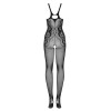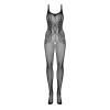 Der schwarze Catsuit G335 von Obsessive ist aus weichem, hochelastischem Fischnetz gefertigt, das sich dem Körper anschmiegt und die Kurven mit seitlichen, ineinander verschlungenen Verzierungen betont. Die elastischen Träger sind am Rücken im Racerback-Stil mit Ausschnitt zusammengefügt, während der offene Schritt einen gewagten und provokanten Touch verleiht.