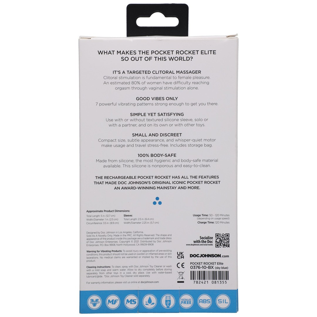 The rechargeable Pocket Rocket Elite combines all the features that made Doc Johnson's original Pocket Rocket an award-winning product, and more. This discreet mini vibrator is made from medical-grade silicone and comes in an elegant pink colour. It is rechargeable and comes with a textured silicone sleeve for extra sensation.