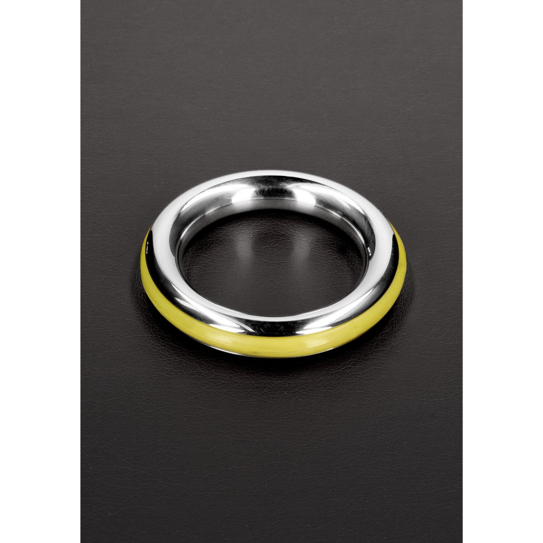Stainless steel cockring with coloured silicone to prolong erection and add style.