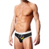 Celebrate Pride in this sexy swim brief featuring Prowlerâs signature paw print logo showcased in the vibrant colors of the LGBTQ Progress Pride flag, honoring all the beautiful, diverse sexual identities. Black and sleek with a stylish contrasting white waistband and leg openings, this brief is comfortable to wear and features a slimming cut that is flattering to wear, comfortable and lightweight for all kinds of activities, from lounging and partying to swimming and more.