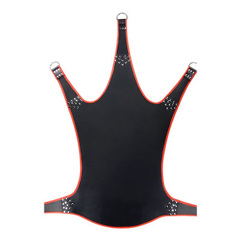 Black leather swing with 5 attachment points and red trim for a bold and comfortable style.