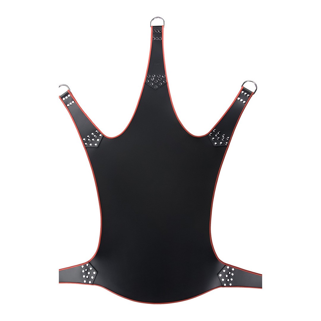 Black leather swing with 5 points features a spacious and comfortable rectangular shape. The red finishes give it a bold and sophisticated style.