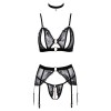 Elegantes und erotisches Set von Abierta Fina, bestehend aus einem Bügel-BH, einem Strumpfgürtel, einem String ohne Schritt und einem Samt-Halsband. Es ist aus zartem schwarzem Tüll mit aufwendigen Stickereien und kleinen Zierpailletten gefertigt und wird durch Accessoires in Roségold sowie elastische Samt-Träger ergänzt, die seinen raffinierten Charakter unterstreichen.