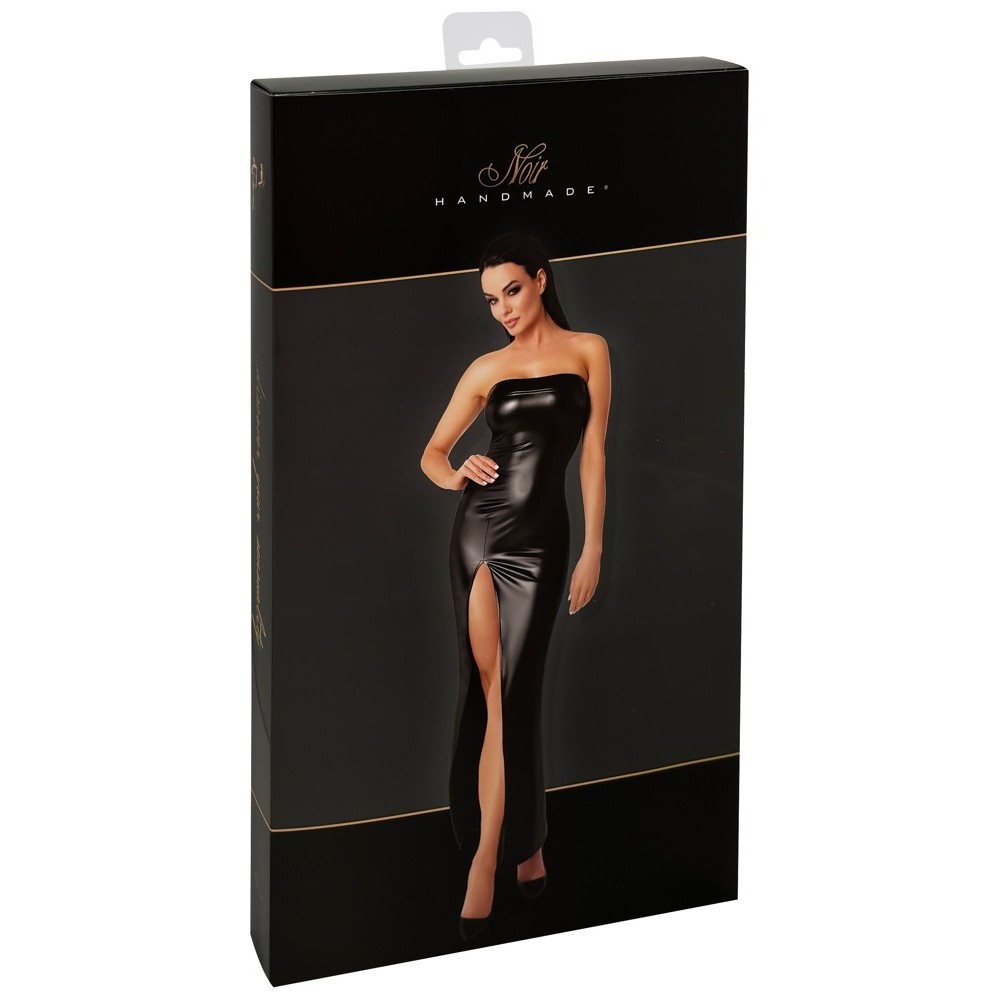 Das lange, figurbetonte Etuikleid von Noir ist aus einem schönen schwarzen Powerwetlook gefertigt. Es ist weich und elastisch für eine hautnahe Passform, aber sehr bequem. Es ist trägerlos und wird durch den breiten, elastischen Ausschnitt gehalten. Mit einem großen Schlitz vorne. Mit einem Reißverschluss hinten.