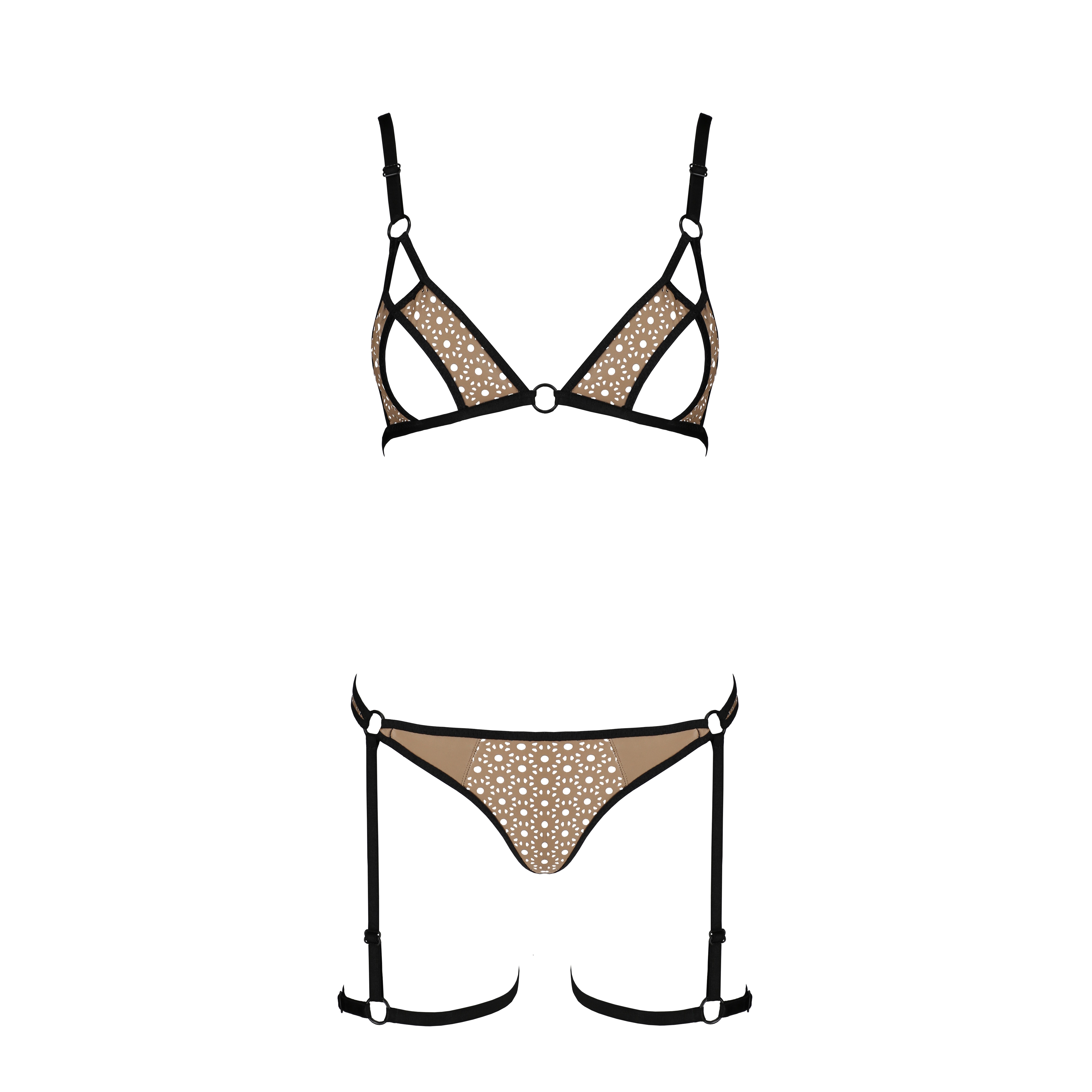 The Gabi set combines sensual cut-outs and joining rings, emphasising the bust and thighs in a unique way. It's made from high-quality materials that provide comfort and durability.