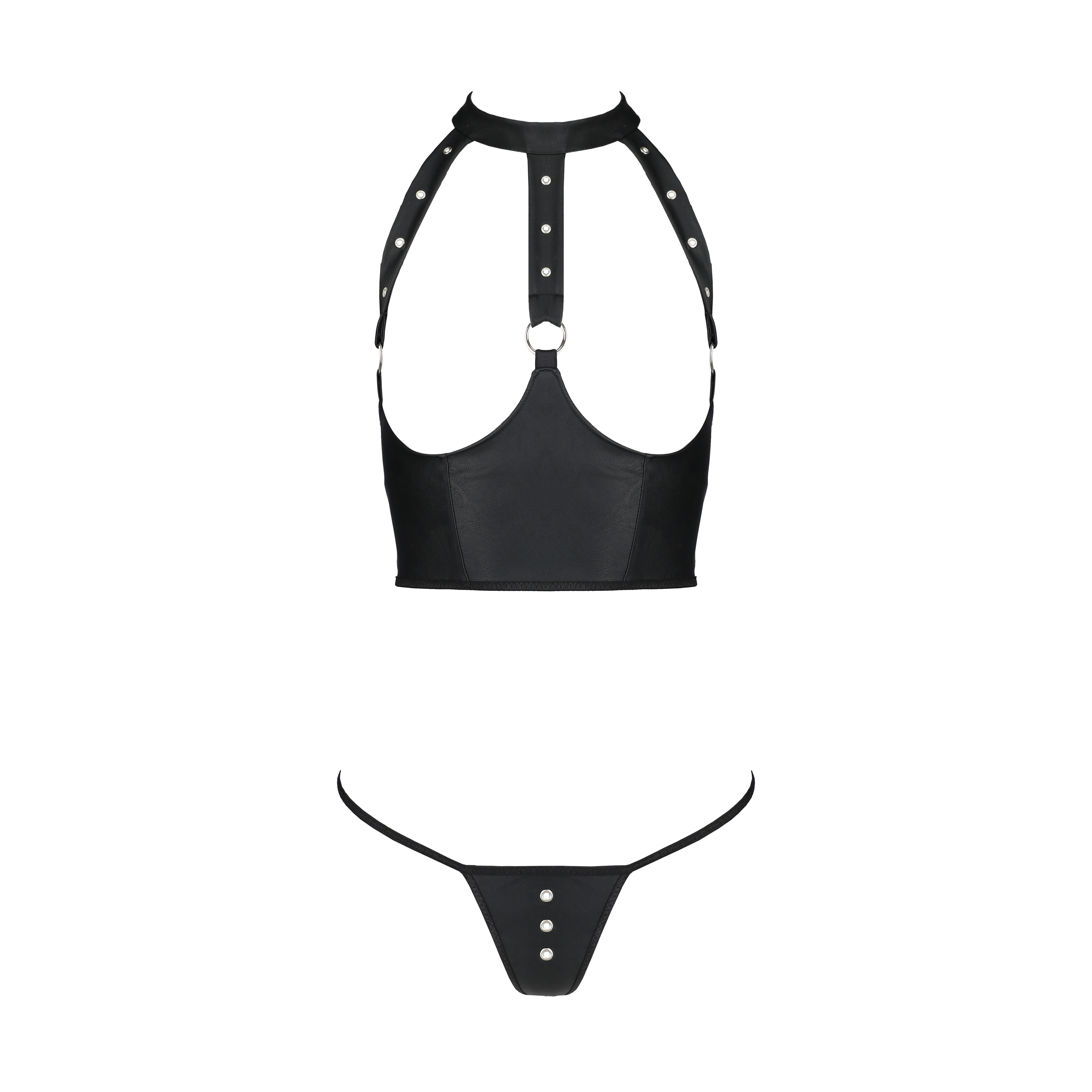 Sensual set with a bold design, open cups, adjustable straps and sophisticated decorative details.