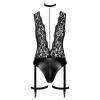 Der schwarze Body mit Hosenträgern von Noir besteht aus einer eleganten Mischung aus weicher, elastischer Spitze (Oberteil) und eng anliegendem, mattem Material (Unterteil). Er ist vorne und hinten sehr tief ausgeschnitten. Außerdem hat er eine Perlenkette im Ausschnittbereich, die am Halsband beginnt und bis zur Taille reicht. Das Halsband hat einen Verschluss auf der Rückseite. Die Träger und die Oberschenkelbänder sind verstellbar. Mit einem Reißverschluss im Schritt.