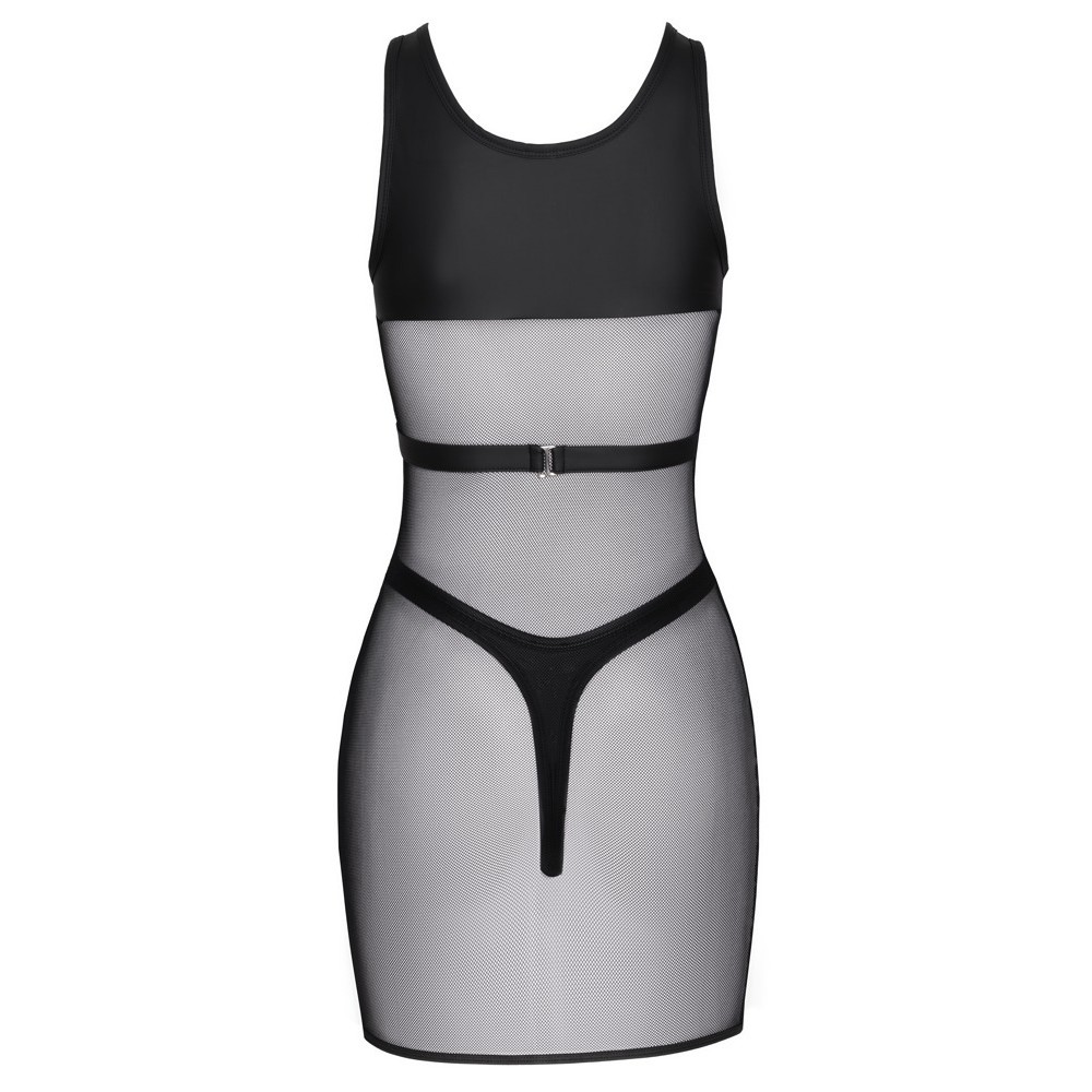The fancy, tight-fitting, black mini dress from Cottelli PARTY is made out of delicate net. It also has a sewn-in and sewn-on matte look chest harness with decorative silver-coloured rings. It is soft and stretchy for a very comfortable fit. The very high leg matte look thong is included.
