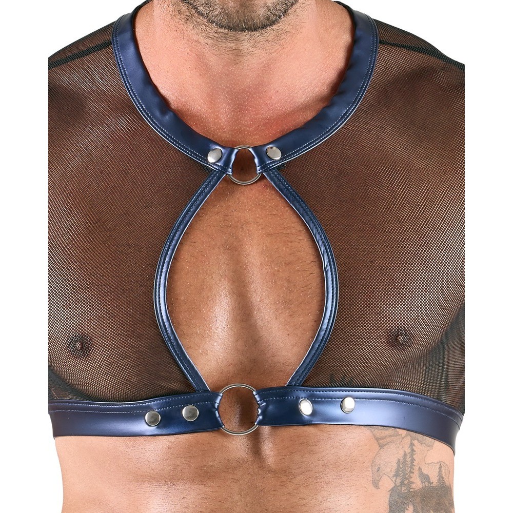 A short, tight-fitting top, emphasising pants and 2 handcuffs from Svenjoyment Bondage in a set. The set is made out of soft & stretchy transparent black net with beautiful sewn-on metallic blue wetlook material.