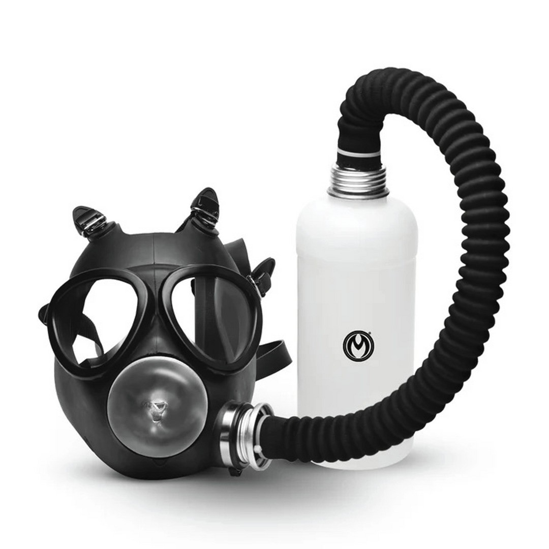 Erotic gas mask with one-way valve, masturbation sleeve and aroma bottle for intense breath play.