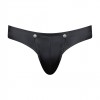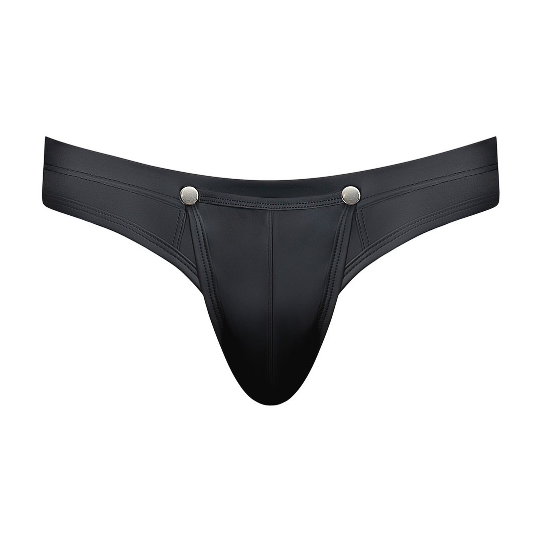 Men's thong with detachable pouch and bold design in matte black spandex for maximum impact and performance.