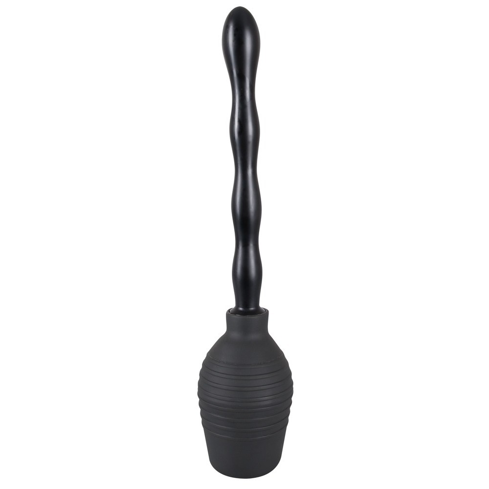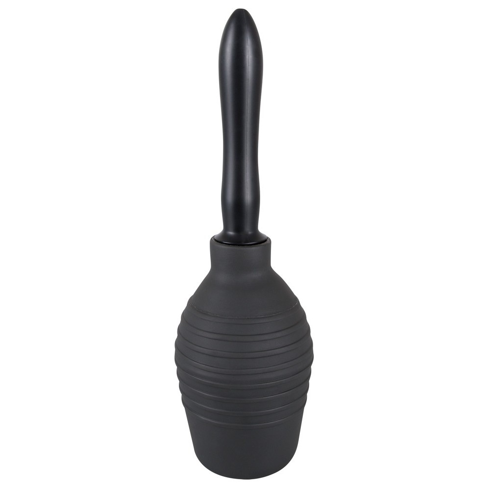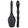 Black intimate douche (height 13 cm, capacity 300 ml) with two interchangeable screw-on attachments, both with spray nozzles. Easy to clean.