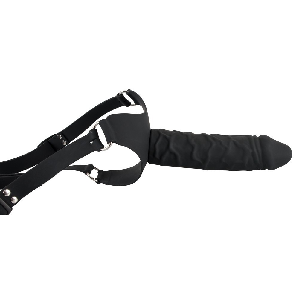 This black strap-on from You2Toys features a large, solid dildo with a pronounced glans and veins. It has short straps on the left and right of the dildo with buckle fastenings.