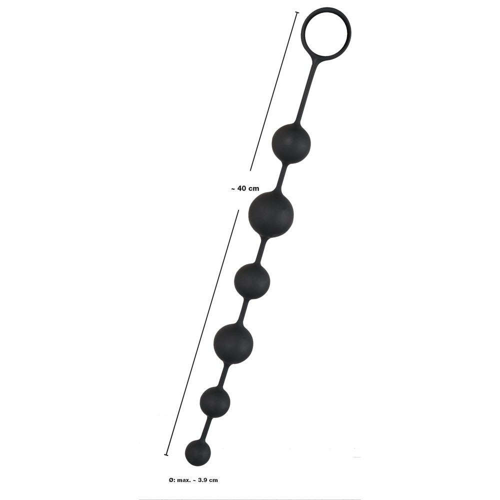 Six black beads on a chain, each with a different size (diameter 2.3–3.9 cm). Slightly flexible and equipped with a retention loop.