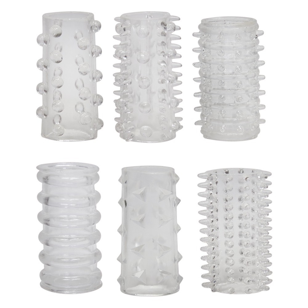 Sex with these transparent penis sleeves becomes six times more exciting and rewarding than ever before. They help prolong pleasure while she enjoys the stimulating textures. Each sleeve is made of a super-soft and flexible material, similar to silicone, which adapts perfectly to the penis. The numerous internal bumps and ridges intensify stimulation, leading both of you to climax.