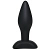 Black anal plug with a narrow tip and wider shaft, designed for progressive and comfortable stimulation. Smooth, silky surface for friction-free insertion. With safety base for greater control.