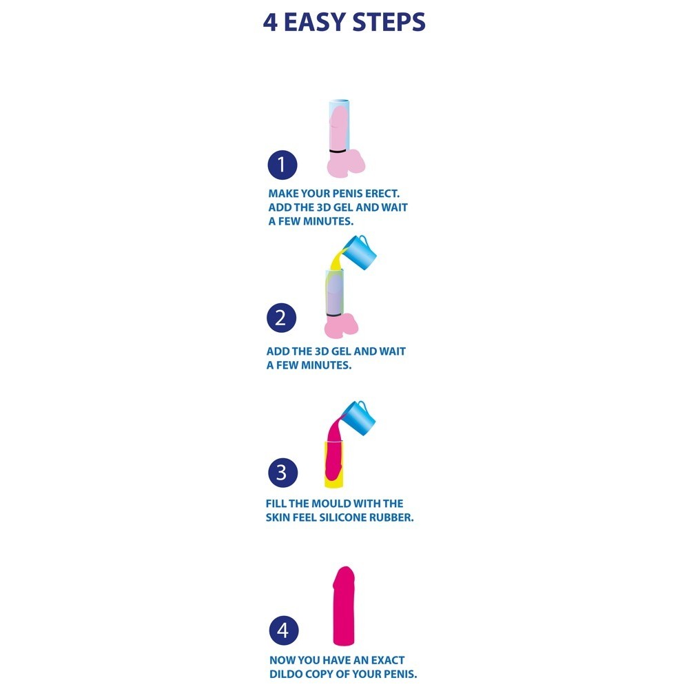 The kit includes: a mould (the packaging itself is used as a mould), a penis strap, a sleeve, a bottle of hardening agent, 3D gel to create the replica, silicone rubber, a pair of plastic gloves, a wooden spatula and detailed instructions (D, NL, FR, EN).