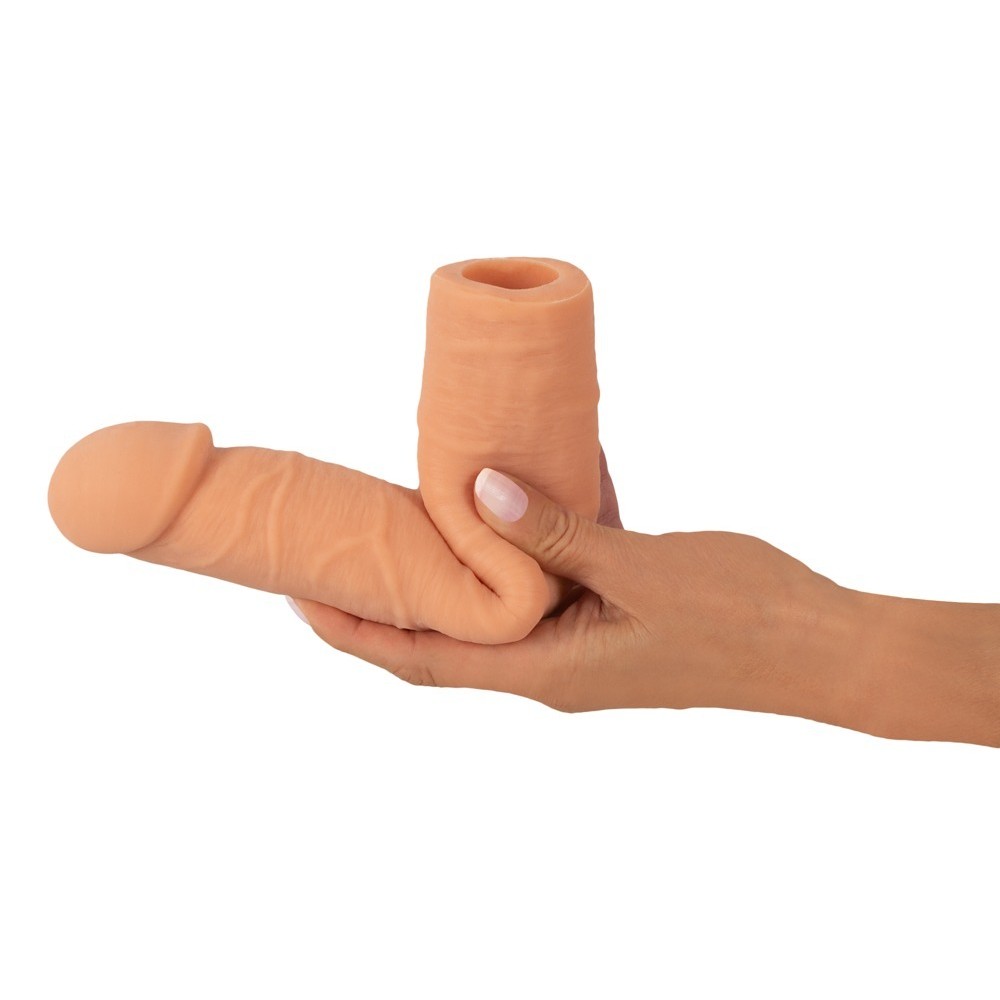 The Extension Sleeve penis sleeve from Nature Skin makes the penis 7 cm longer and about 2 cm thicker. The sleeve, with pronounced veins and a protruding glans, can be easily placed over the penis and used for moments of deep and rewarding pleasure.