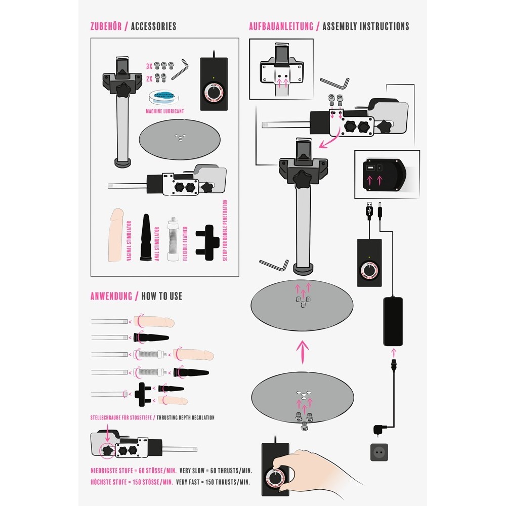 Sex machine with adjustable support and two accessories included. It can be controlled via remote control and rotates up to almost 360 degrees. It offers up to 150 pulses per minute with various speeds, making it ideal for completely hands-free use. It has a slim, modern and stable design. Includes a 1.5 metre long power cable and Schuko type F plug. Double penetration accessory included for even more intense experiences.