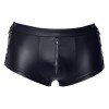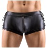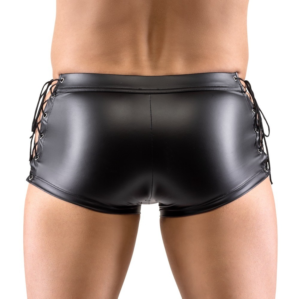 Slim-fit shorts by Svenjoyment, made from a slightly stretchy fabric with a modern matte finish. They feature side ties for size adjustment and a padded zip at the front, offering a sensual yet practical touch.
