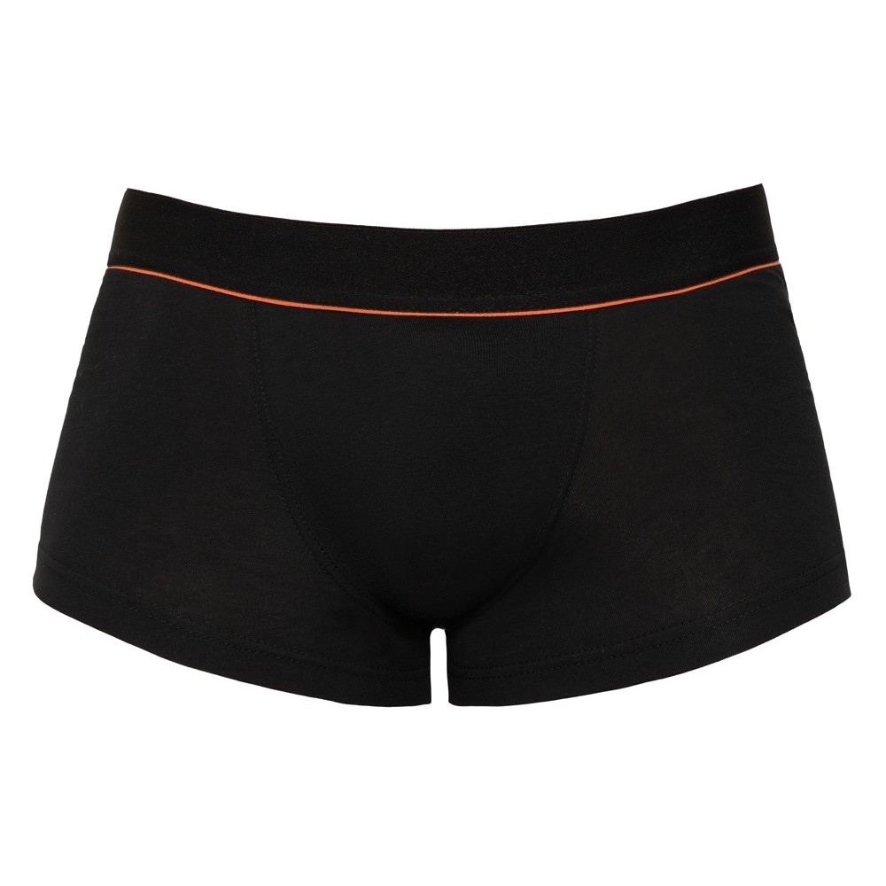 Slim-fit black boxer shorts from Svenjoyment, featuring a striking red stripe beneath the covered waistband. They have a double-layer front panel and offer exceptional comfort, thanks to their perfect fit and the stretchy, Oeko-Tex-certified organic cotton fabric.