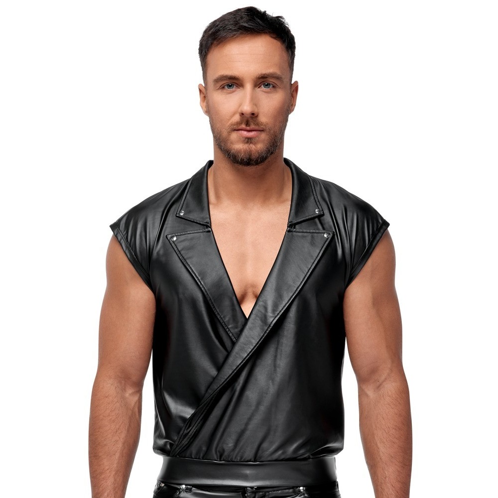 A loose-fitting NEK shirt in stylish matt black, featuring overlapping sleeves and an elasticated hem. Open front with an overlapping panel and a long lapel collar with studs, for a bold look. Soft and stretchy, it ensures maximum comfort all day long.