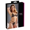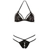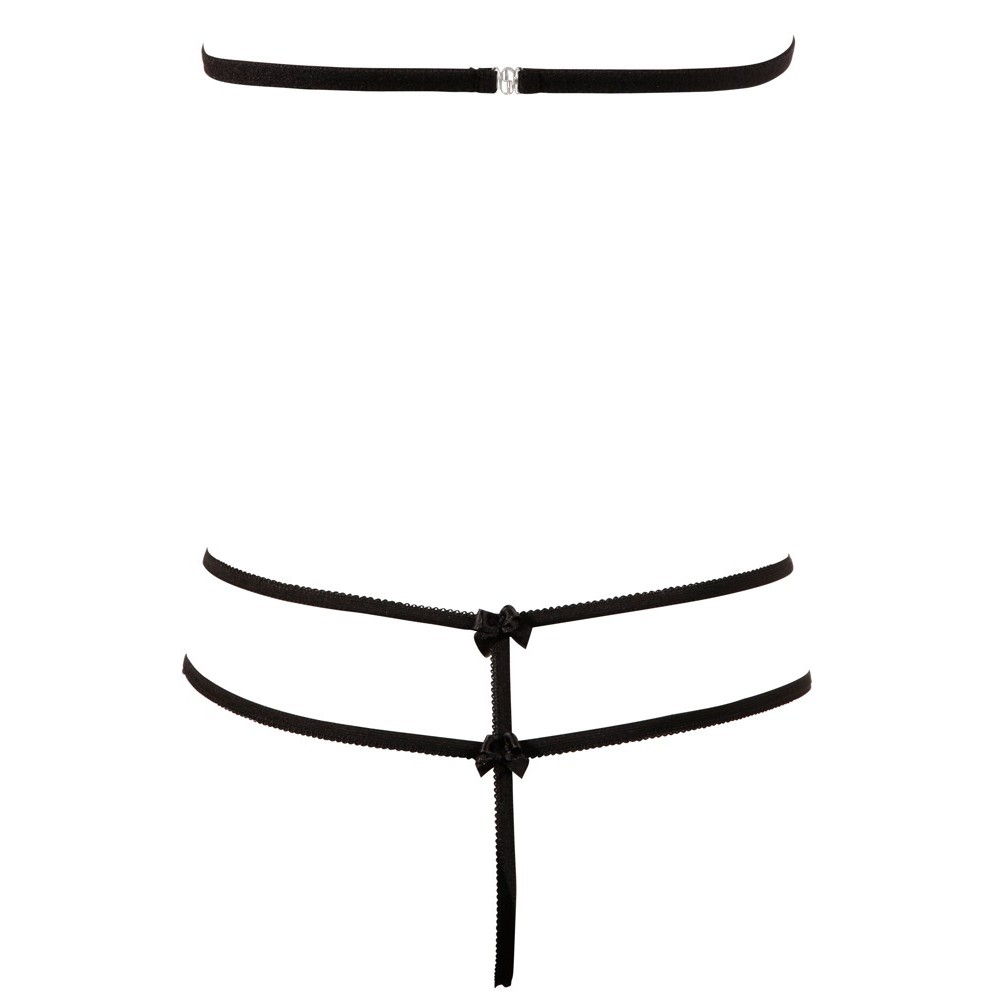 This sensual set awakens all desires: a delicate, wire-free bra with a halter neckline, made from elegant floral lace. It features straps and cups that can be folded down, creating an even more provocative effect. The matching thong, without a crotch, includes additional decorative straps that give it an extremely sensual and sophisticated look.