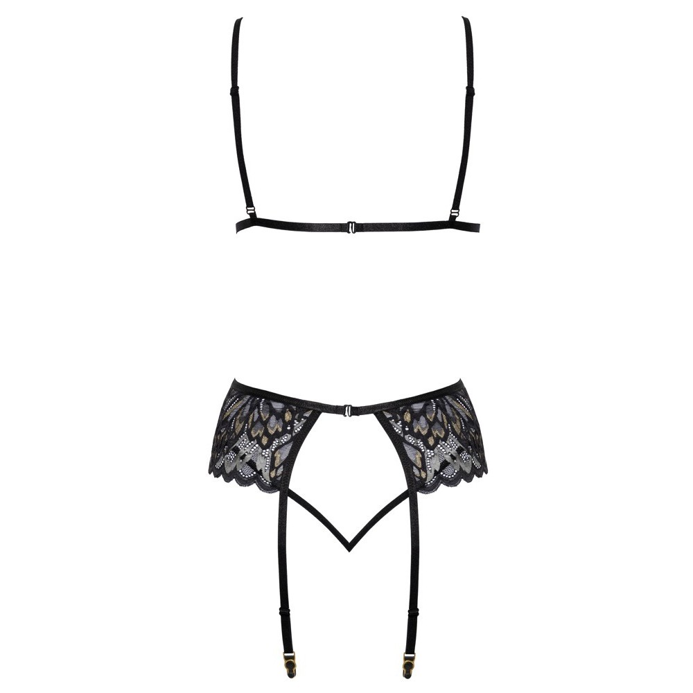 The Kissable set comprises a non-wired bra, garter belt and thong, crafted from delicate lace and powernet. All pieces are soft and stretchy, ensuring an extremely comfortable fit. The bra has adjustable straps and a hook-and-eye fastening at the back. The suspender belt also features a hook-and-eye fastening at the back and adjustable suspender straps. The thong, with its daring design, stands out for its two thin, stretchy straps that meet at the front.
