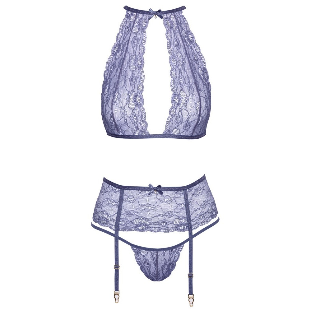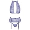 A Kissable set comprising a non-wired bra, garter belt and thong, made entirely from delicate lace. Soft and stretchy, offering exceptional comfort when worn. The elegant bra features a hook-and-eye fastening at the nape of the neck and across the back. The garter belt features a hook-and-eye fastening at the back and adjustable garters. The tiny thong is extremely seductive thanks to the two thin, stretchy straps at the front.
