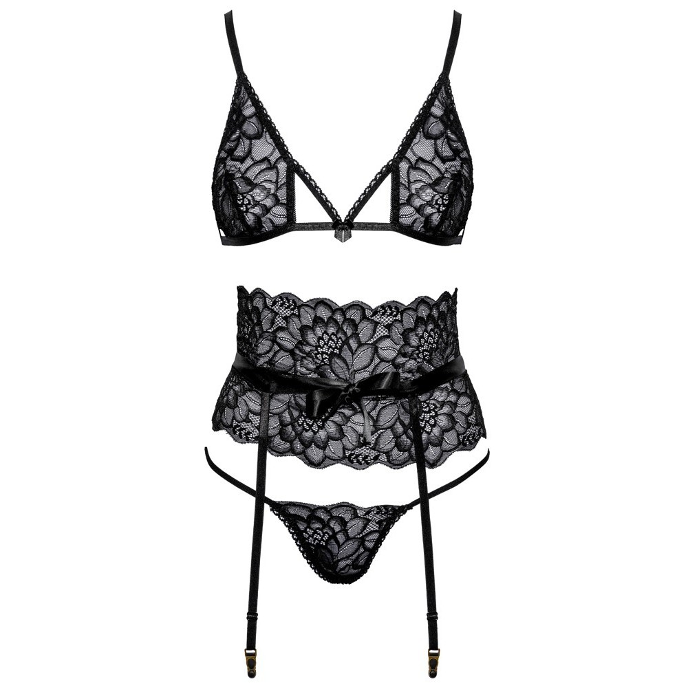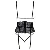 An elegant set from Kissable comprising a wireless bra, garter belt and thong, crafted from fine black lace. All pieces are soft and stretchy, ensuring a comfortable fit. The bra features a hook-and-eye fastening at the back and adjustable straps. The garter belt accentuates the waist and includes eye-catching satin ties that can be tied at the front, as well as a hook-and-eye fastening at the back and adjustable garter straps. The seductive thong stands out for its two thin, stretchy straps that meet at the front.