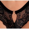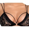 Cottelli LINGERIE set consisting of a soft bra and thong, in soft, stretchy black lace, with elegant velvet straps on the bra and waistband of the thong. The bra features decorative underwiring between the cups, double elastic straps at the front and adjustable straps at the back, as well as a hook-and-eye fastening at the back. The thong stands out for its small front cut-out with a decorative ring on the waistband and a delicate string of black pearls sewn into the intimate area, for a subtly stimulating sensation with every movement.