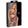 Cottelli LINGERIE set consisting of a bra and thong with an open and daring harness design. It features soft elastic bands and straps, joined by rose gold-toned rings, for an elegant and striking look. The bra has a back closure and adjustable straps. The high-waisted thong stands out for its open crotch with two elastic bands and adjustable thigh straps (without clips).