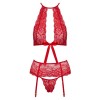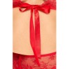 The Kissable set comprises a soft bra, garter belt and thong, entirely crafted from fine red lace with elegant golden details. Soft and stretchy for maximum comfort when worn. The bra features a satin bow at the front, with hook-and-eye fastenings at the neck and back. The garter belt features a satin bow at the back and adjustable garters. The seductively designed lace thong stands out for its two fine, stretchy straps that meet at the front.