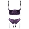 Cottelli LINGERIE set consisting of a square cup bra and thong with no crotch. It is made of dark purple stretch satin with an elegant ruffled effect and black details.