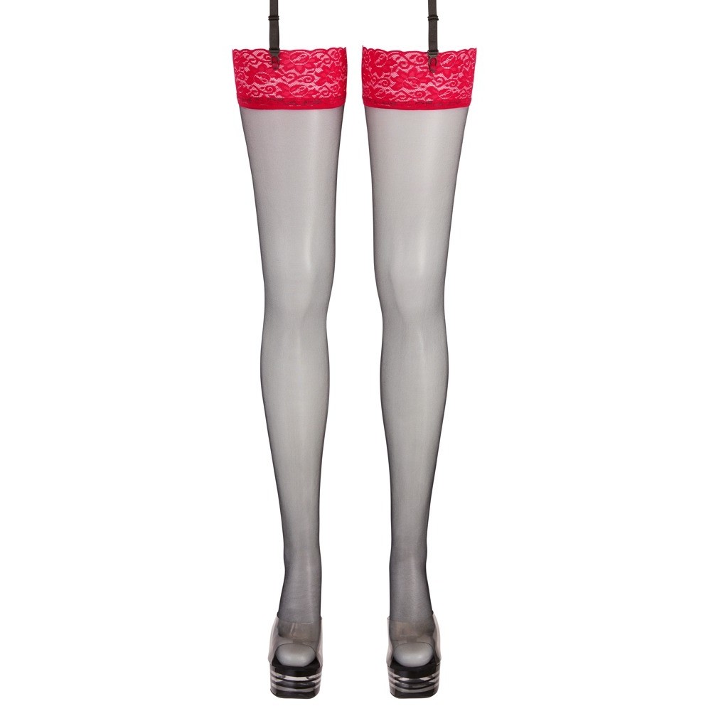 Sensual stockings with red lace at the top, ideal for wearing with suspenders. 20 denier, with slightly pre-formed toe for greater comfort and Oeko-Tex certification.