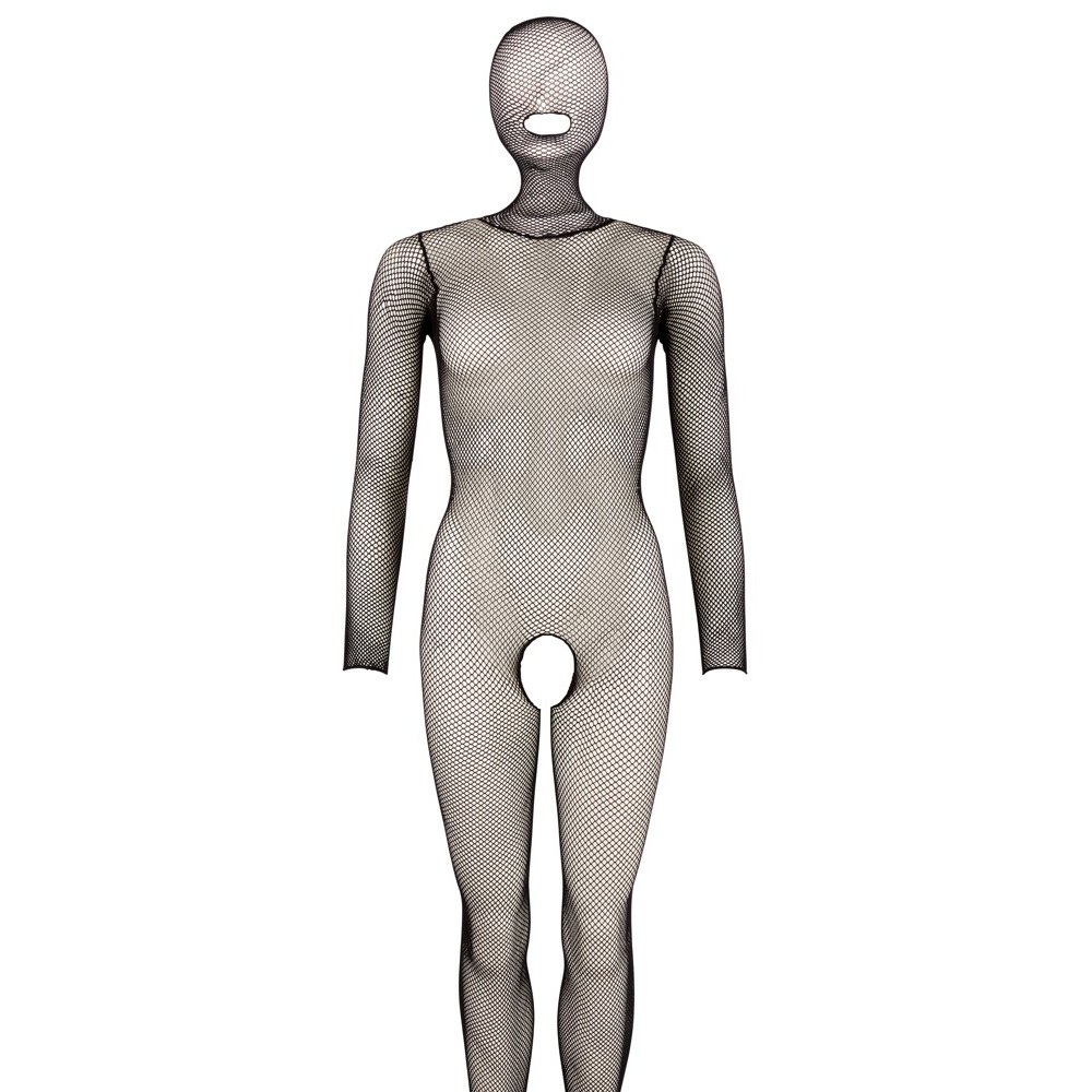 Made from fine, highly elastic mesh, it fits the body perfectly, offering comfort and freedom of movement. The design features an opening at the neckline, 3/4-length sleeves, an open crotch and integrated feet, creating a provocative and alluring look. To put it on, simply slip it on through the opening at the back.