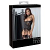 A Abierta Fina bodice and thong set, crafted from stretch satin with elegant lace inserts and rose gold-tone detailing. The integrated underwired bra, featuring underwires and lightly padded cups, enhances the bust and draws attention to it. The two adjustable neckline straps attach to the bra straps and the choker, creating a sophisticated and original look. The choker has a hook-and-eye fastening. The decorative rhinestone chains, positioned over the chest and shoulders, are removable thanks to the press stud fastenings. It also includes a thong made of stretch satin, with a removable decorative chain in the crotch area.
