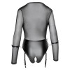 A very low-cut teddy from Cottelli BONDAGE with garter straps. The top of this long-sleeved teddy is made from sheer powernet, whilst the thong-style bottom is crafted from a modern, matte-finish fabric – the perfect ensemble for spontaneous sex! The belt is sewn onto the teddy and features two rings at the front and one ring on each side. The included handcuffs can be attached to the rings using the snap hooks. The handcuffs can be adjusted with hook-and-loop fasteners. The adjustable suspender straps can be removed.