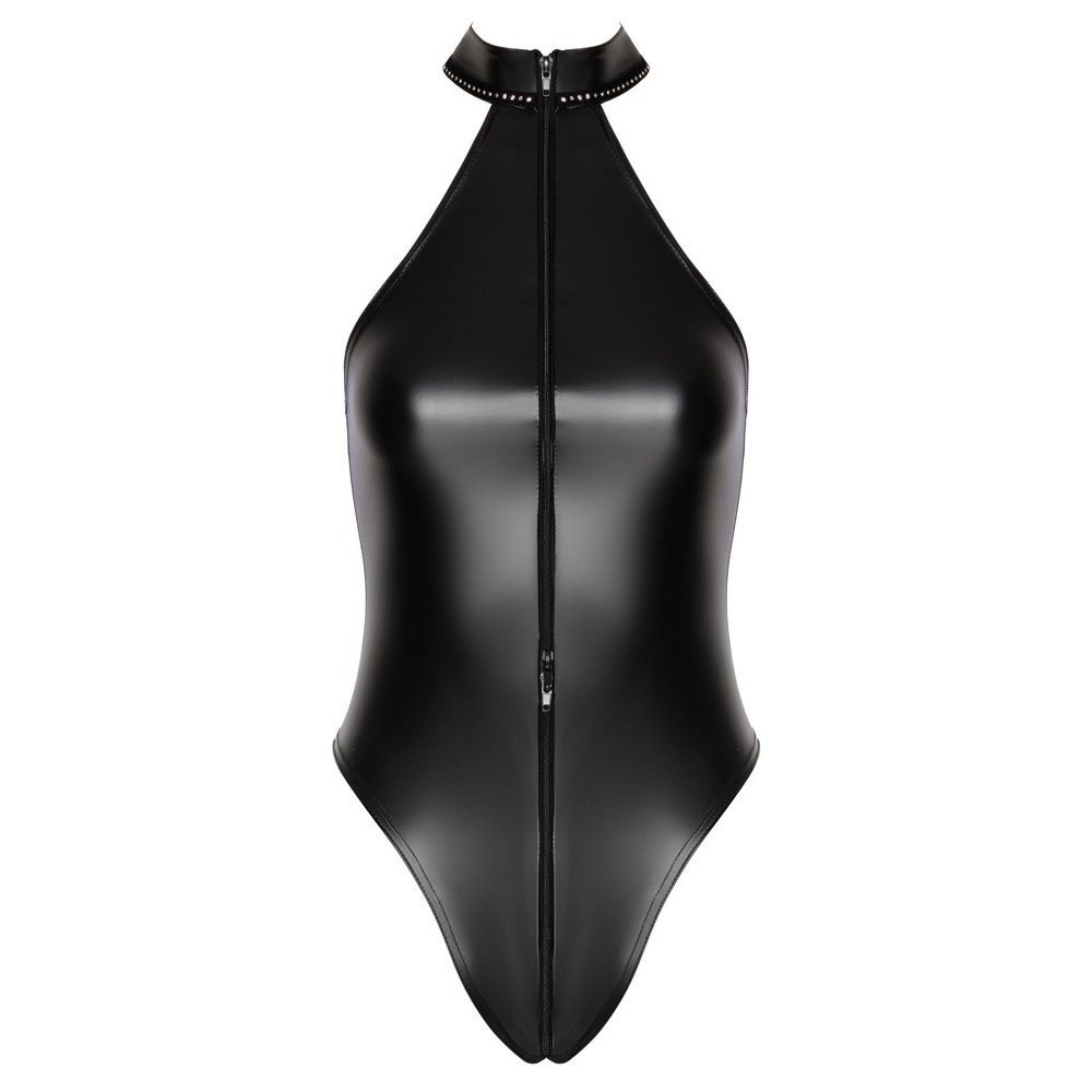 Noir's figure-hugging bodysuit in black power wetlook fits like a second skin. Soft and highly elastic, it guarantees maximum comfort. Fitted, strapless design with a high neckline decorated with rhinestones for a luxurious touch. The two-way zip fastening runs the entire length from the collar, through the crotch area and ends above the buttocks. The extra-high cut legs provocatively enhance the legs and bum.