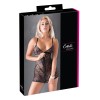 Short, tight-fitting dress from Cottelli LINGERIE with a two-piece look. The top is made of fine teal lace, while the skirt is made of an elegant black material with a matte finish. Deep neckline down to the navel, held in place by three rose gold rings and elastic straps that ensure a perfect fit. Backless, the halter neck fastens with a practical clip fastener.