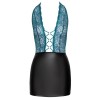 Short, tight-fitting dress from Cottelli LINGERIE with a two-piece look. The top is made of fine teal lace, while the skirt is made of an elegant black material with a matte finish. Deep neckline down to the navel, held in place by three rose gold rings and elastic straps that ensure a perfect fit. Backless, the halter neck fastens with a practical clip fastener.