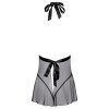 Short, flowing chemise by Kissable, made from beautiful sheer black lace (top) and delicate powernet fabric (skirt). Silky, soft and stretchy for a comfortable fit. The backless nightdress features a large cut-out at the neckline. The satin collar can be tied at the back of the neck and the satin waistband can be tied at the back to enhance the silhouette. Matching thong included.