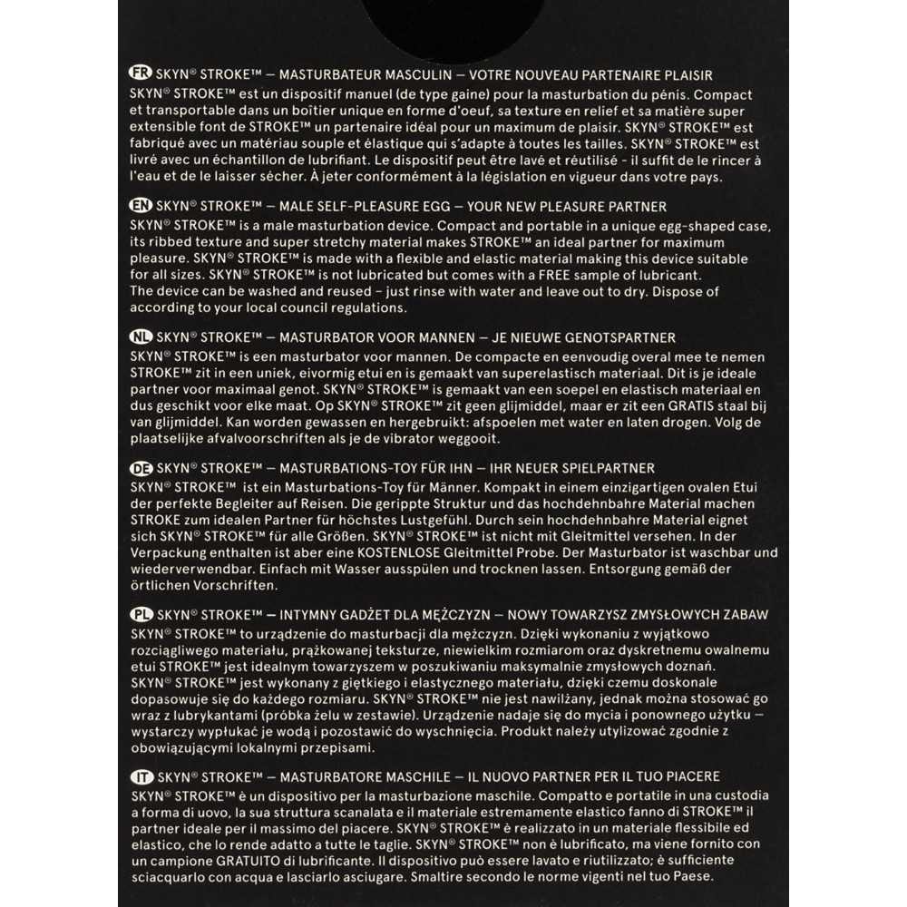 Skyn's compact, reusable Stroke masturbator is designed to provide an intense massage to the penis, ideal for moments of pleasure alone or with a partner. The ultra-flexible masturbator sleeve comes in a discreet egg-shaped box and includes lubricant. After use, simply wash with soap and water for easy and effective cleaning.
