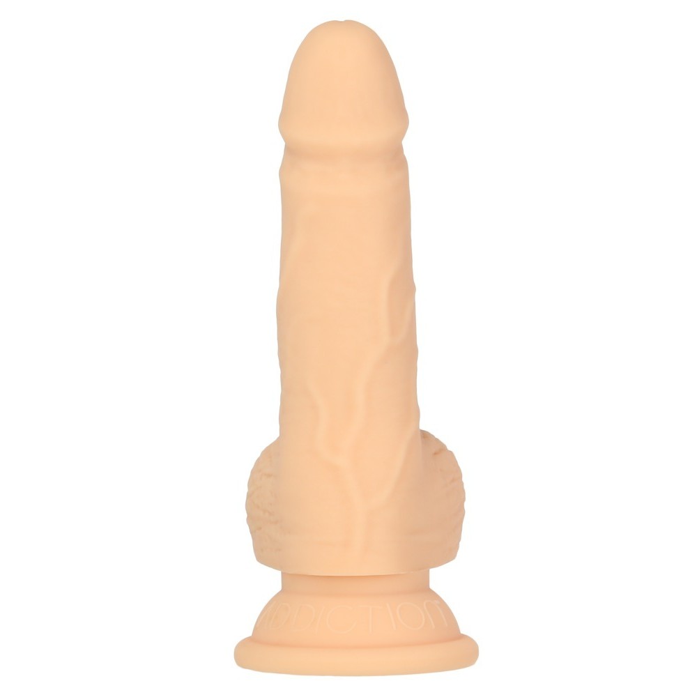 The 6.5" Flexible Thrusting Dong RC Vibrator from Naked Addiction features a realistic design with subtle veins and a pronounced glans. It has a sturdy suction cup under the testicles that adheres firmly to smooth surfaces, allowing for hands-free use.